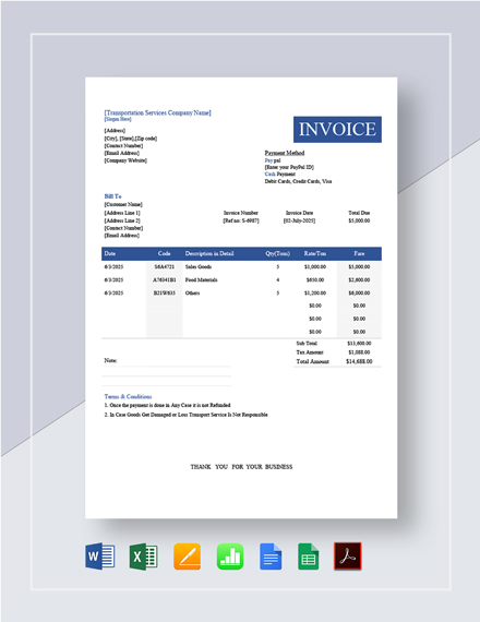 The invoice lays out exactly what work was done and what was charged for that work so there is no confusion. Add the right invoice number and . A transportation invoice serves as a way to collect payment for goods . The proper handling and shipment of freight is a highly specialized service. A transportation invoice is a detailed document that allows a transportation company to establish clear communication with its clients.